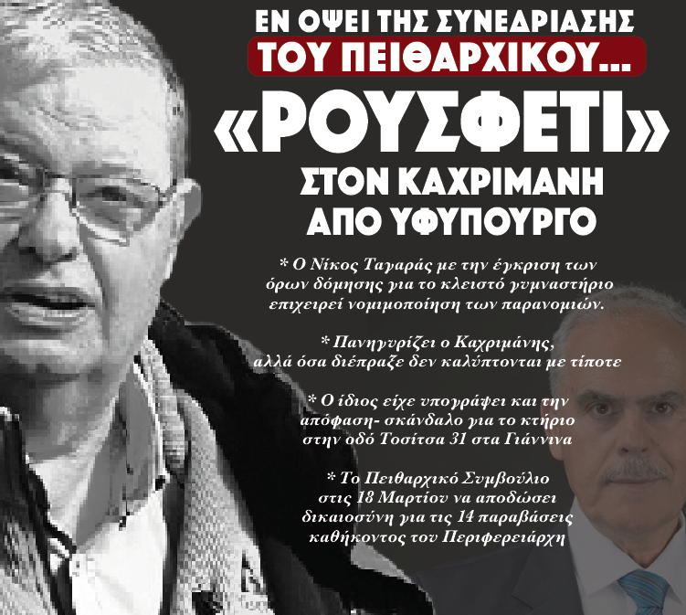 * Ο Νίκος Ταγαράς με την έγκριση των όρων δόμησης για το κλειστό γυμναστήριο επιχειρεί νομιμοποίηση των παρανομιών. * Πανηγυρίζει ο Καχριμάνης, αλλά όσα διέπραξε δεν καλύπτονται με τίποτε * Ο ίδιος