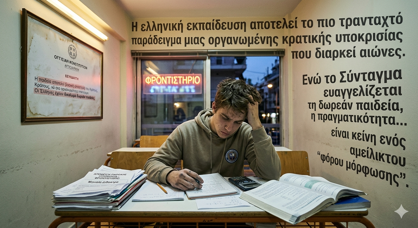 Η ελληνική εκπαίδευση αποτελεί το πιο τρανταχτό παράδειγμα μιας οργανωμένης κρατικής υποκρισίας που διαρκεί αιώνες. Ενώ το Σύνταγμα ευαγγελίζεται τη δωρεάν παιδεία, η πραγματικότητα που βιώνει κάθε ελληνικό νοικοκυριό είναι εκείνη ενός αμείλικτου «φόρου μόρφωσης», ο οποίος εισπράττεται καθημερινά στα φροντιστήρια της γειτονιάς. Σύμφωνα με το typolitics.gr, η πρόσφατη έρευνα του ΚΑΝΕΠ/ΓΣΕΕ δεν είναι απλώς μια στατιστική απεικόνιση, αλλά ένα δριμύ «κατηγορώ» ενάντια σε ένα σύστημα που έχει μετατρέψει τη γνώση σε ακριβό εμπόρευμα και το δημόσιο σχολείο σε έναν άδειο σκελετό, ικανό μόνο να διεκπεραιώνει γραφειοκρατικές διαδικασίες. Η ιστορική αναδρομή που φτάνει μέχρι τον 17ο αιώνα αποδεικνύει ότι το…