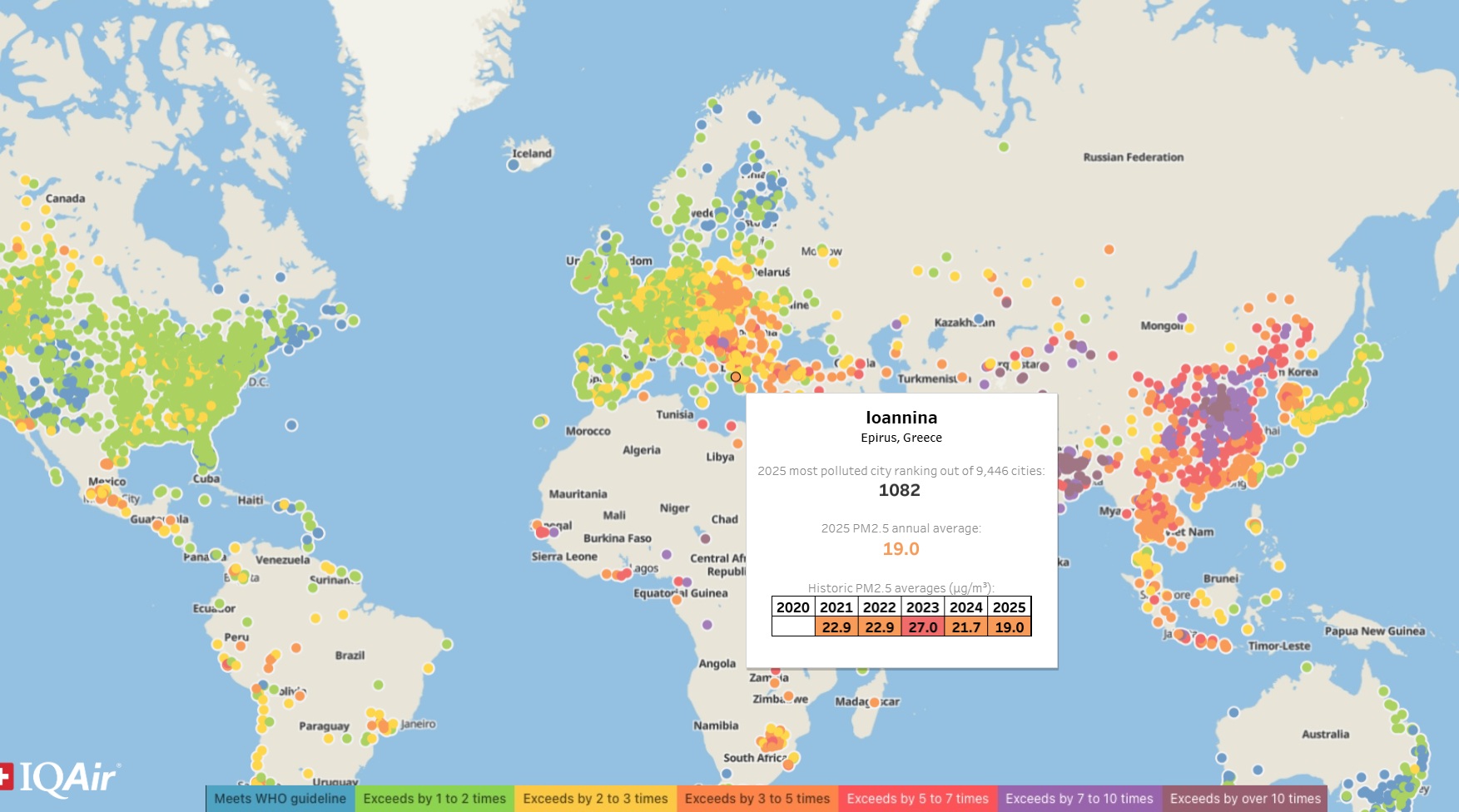 Η αθλιότητα που αναπνέουμε στα Γιάννενα απέκτησε πλέον και επίσημη παγκόσμια «πιστοποίηση». Ενώ οι τοπικοί άρχοντες επιδίδονται σε επικοινωνιακά σόου για την «πράσινη ανάπτυξη» και την τουριστική βιτρίνα, η έκθεση της IQAir για το 2025 έρχεται να γκρεμίσει το αφήγημα της ειδυλλιακής πρωτεύουσας της Ηπείρου. Σύμφωνα με το typolitics.gr, τα Ιωάννινα δεν είναι απλώς μια πόλη με «λίγη ομίχλη», αλλά μια περιοχή που ανήκει στο διαβόητο 8% των πιο μολυσμένων σημείων του πλανήτη. Η πραγματικότητα είναι ωμή: το λεκανοπέδιο έχει μετατραπεί σε μια αέρια παγίδα θανάτου, όπου οι κάτοικοι εισπνέουν καθημερινά ένα κοκτέιλ μικροσωματιδίων που ξεπερνά κατά 4,3 φορές τα όρια του Παγκόσμιου Οργανισμού Υγείας.