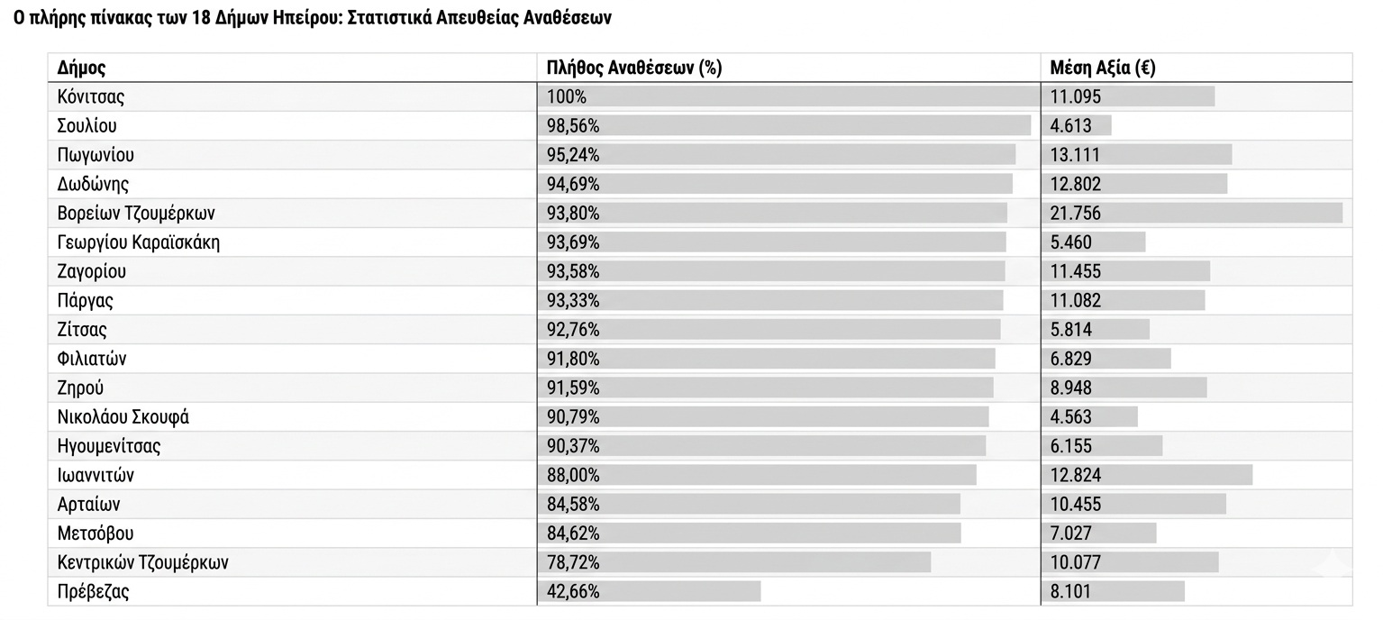 Ακόμα και στον κεντρικό Δήμο Ιωαννιτών, το 88% των συμβάσεων περνάει από το γραφείο του δημάρχου χωρίς διαγωνισμό, με τη μέση αξία να φτάνει τις 12.824 ευρώ, ένα ποσό που «φλερτάρει» επικίνδυνα με τα όρια του νόμου για να αποφεύγεται η όποια σοβαρή γραφειοκρατία. Αντίστοιχη είναι η εικόνα στην Άρτα με 84,58% και στην Ηγουμενίτσα με το εξωφρενικό 90,37%. Μοναδική εξαίρεση σε αυτόν τον βούρκο της αδιαφάνειας αποτελεί ο Δήμος Πρέβεζας, ο οποίος με 42,66% δείχνει ότι υπάρχει και άλλος δρόμος, αν και παραμένει η μοναχική φωνή σε μια περιφέρεια που έχει μάθει να ζει με το «δικό μας παιδί». Σύμφωνα με το typolitics.gr, το πρόβλημα δεν είναι μόνο η συχνότητα αλλά και το ύψος των ποσών, με τον Δήμο Βορείων Τζουμέρκων να καταγράφει μέση αξία ανάθεσης τις 21.756 ευρώ, ποσό που προκαλεί το δημόσιο αίσθημα σε μια εποχή βαθιάς οικονομικής κρίσης.